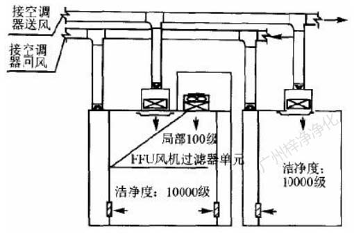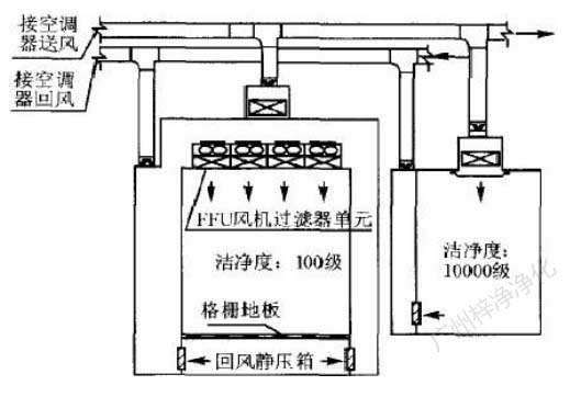 此方式的缺點是設(shè)置循環(huán)風(fēng)機箱及處理噪聲,需要較大的空間,而通常百級區(qū)周圍風(fēng)管都比較密集,需要精心布局。此方式百級區(qū)上部靜 壓箱相對百級區(qū)室內(nèi)為正壓,頂棚高效過濾器與吊架間的滲漏,為靜壓箱流向室內(nèi),直接影響百級區(qū)潔凈度。對施工質(zhì)量要求較高。(具 體可參考: