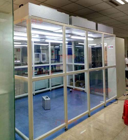 千級(jí)潔凈棚(1000級(jí)潔凈棚)采用工業(yè)鋁材(或不銹鋼方通、鐵方通噴塑)作為框架,風(fēng)機(jī)濾網(wǎng)機(jī)組(FFU)送風(fēng),四周懸掛防靜電垂簾(或鋼化玻璃),其內(nèi)部凈化級(jí)別可達(dá)到100級(jí)-10000級(jí)。適用于操作區(qū)內(nèi)局部凈化級(jí)別要求高的區(qū)域。